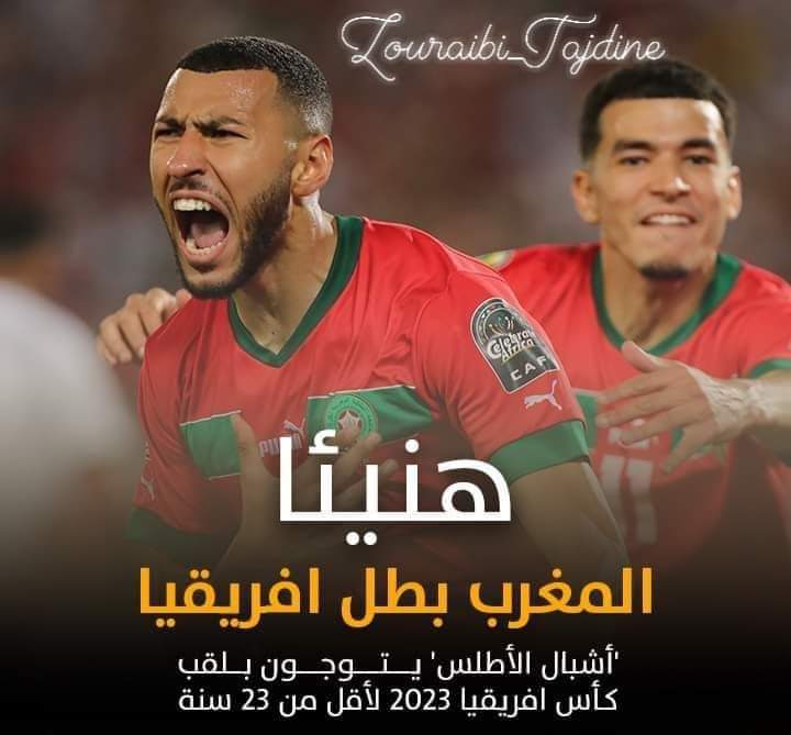توج #المنتخب_المغربي لأقل من 23 سنة، بلقب كأس افريقيا للأمم 2023، بعد حسمه للمباراة النهائية أمام منتخب #مصر، السبت 8 يوليوز ، على أرضية ملعب مركب مولاي عبد الله بالرباط.الوقت الأصلي للمباراة النهائية انتهى بالتعادل 1-1 قبل أن يتم الاحتكام إلى الشوطين الإضافيين ، ليحسم المغاربة المباراة بهدف رائع للاعب أسامة ترغالين في الشوط الإضافي الأول.هنيئا لمنتخبا الوطني بهذا التتويج الجديد ، الذي يكرس تفوق وتوهج كرة القدم الوطنية، قاريا ودوليا، ويعكس نتائج وثمار سياسة التكوين بفضل رؤية وسياسة ملكية سديدة.