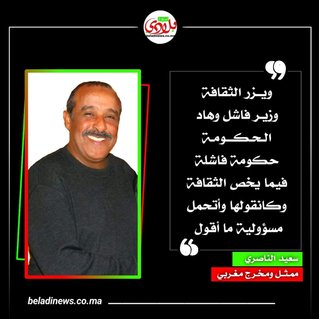 سعيد الناصيري دخل طول وعرض في وزير الثقافة والحكومة حيث أشار من خلال تصريح إعلامي إلى أشياء تخص المجال الفني والثقافي بالمغرب ومن أهم ما صرح الممثل والمخرج المغربي سعيد الناصري أنه وصف الحكومة و وزير الثقافة بالفشل