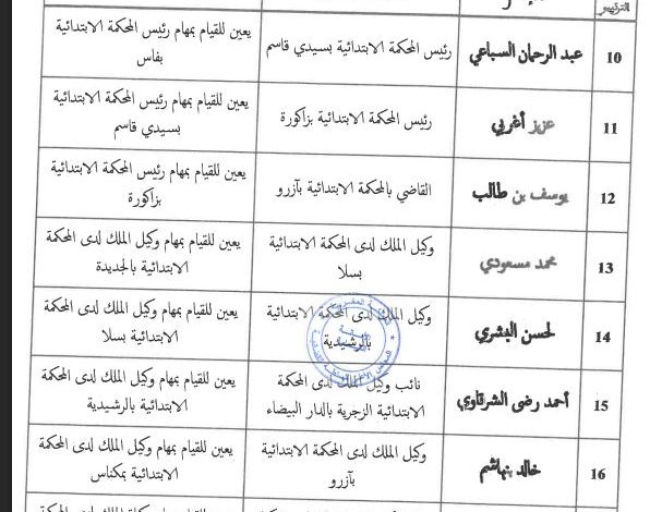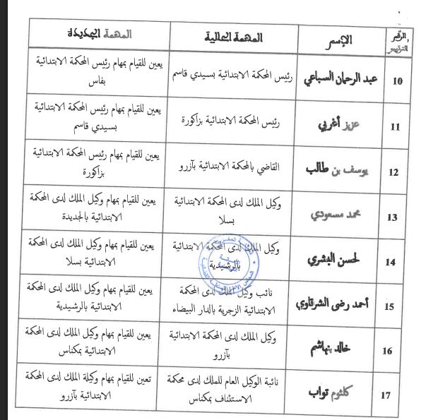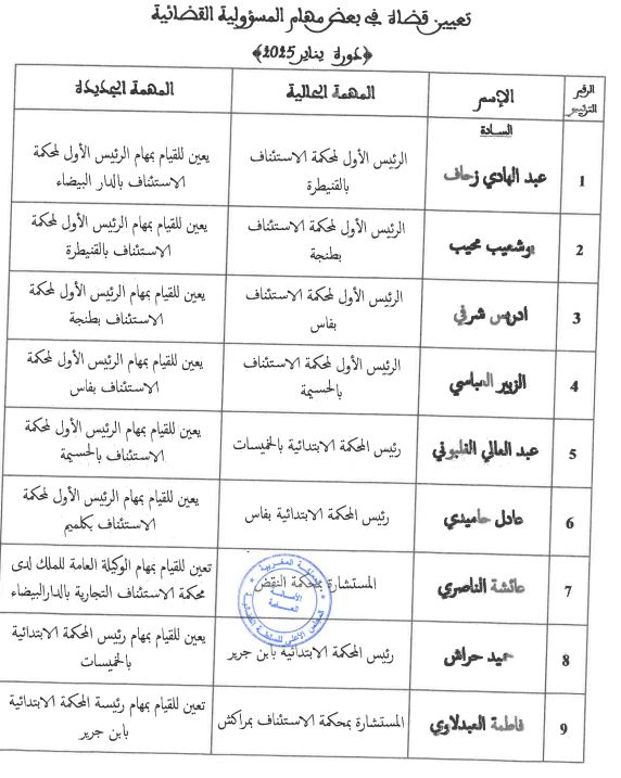 - الزبير العباسي، الرئيس الأول لمحكمة الاستئناف بالحسيمة، عُيّن رئيسًا أول لمحكمة الاستئناف بفاس.