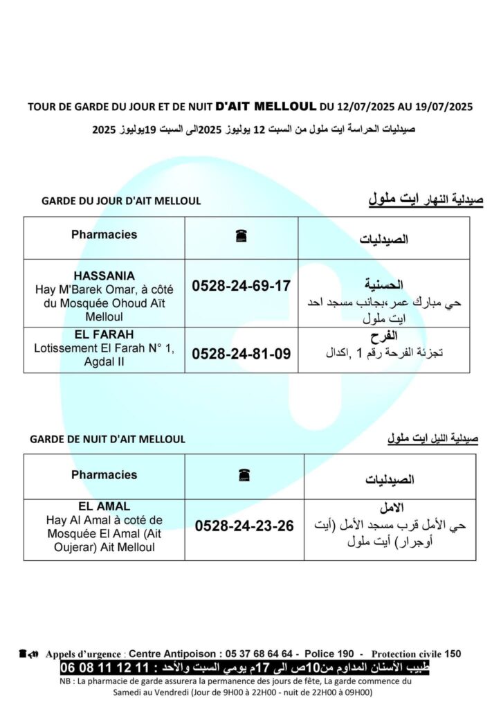 في إطار حرص الجهات الصحية على ضمان استمرارية الخدمات الصيدلانية وتلبية احتياجات المواطنين من الأدوية على مدار الساعة، تُعلن صيدليات الحراسة في مناطق أيت ملول، إنزكان، أكادير، تيكوين، ومنطقة السلام-الهدى عن جدول الحراسة الأسبوعي الممتد من يوم السبت 12 يوليوز 2025 إلى يوم السبت 19 يوليوز 2025.