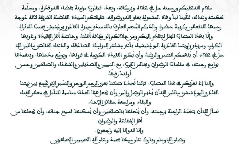 واختتم رسالته بتقديم خالص التعازي والدعاء، داعيًا الله أن يُلهم ذوي الفقيدة جميل الصبر، وأن يُجزل لهم الأجر، وأن يُبارك في خطوات الشيخ مولاي جمال القادري بودشيش، حفظه الله وأيّده.