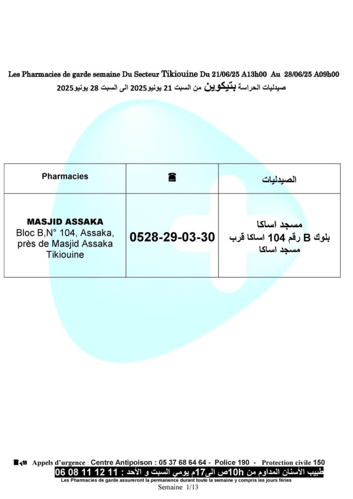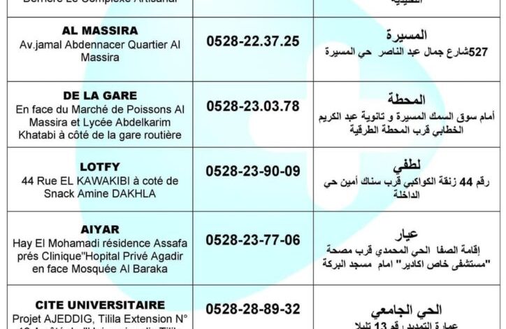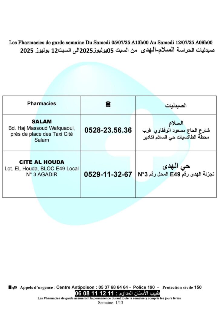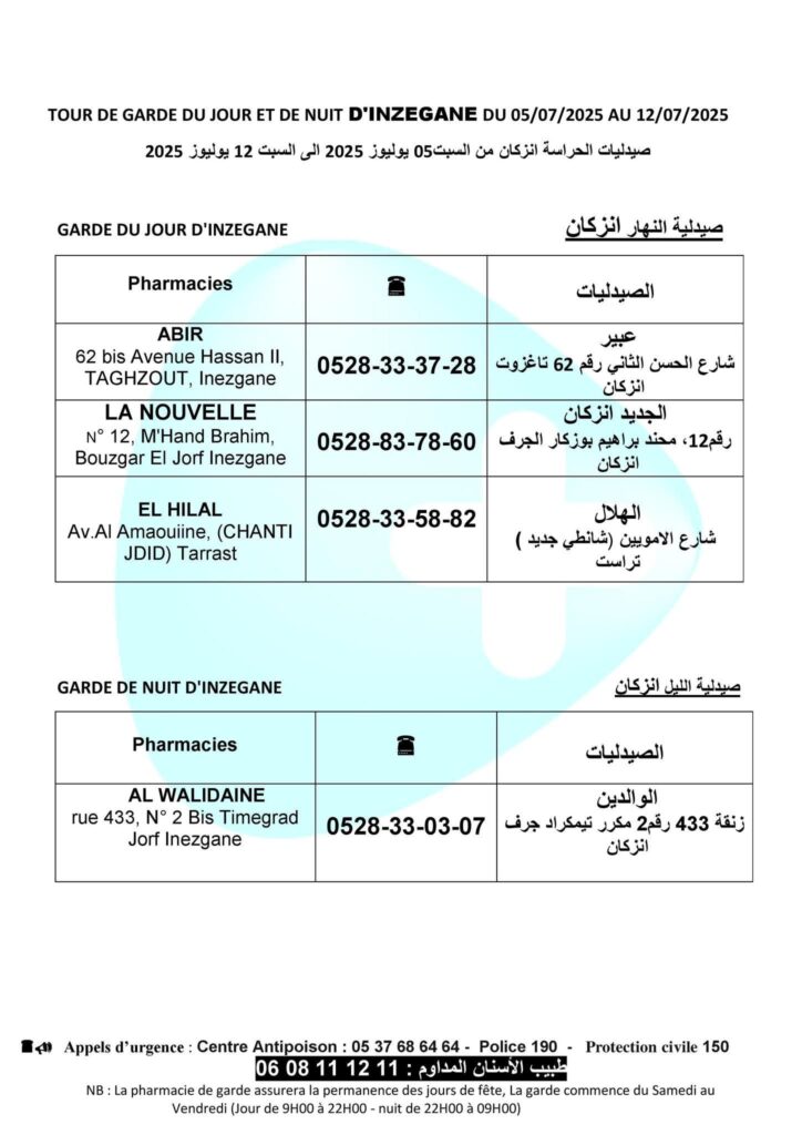 هذه لائحة لصيدليات الحراسة لهذا الأسبوع باكادير وانزكان وتكوين وايت ملول من السبت 5يوليوز الى 12منه