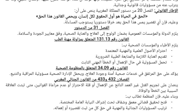 بقلق بالغ واقعة وفاة سيدة تبلغ من العمر 31 سنة، أم لثلاثة أبناء، إثر مضاعفات أعقبت عملية قيصرية، حيث أكد تقرير طبي أن سبب الوفاة هو نزيف حاد.وإذ تتقدم المنظمة بأحر التعازي إلى أسرة الفقيدة، فإنها تؤكد أن هذه الواقعة تطرح شبهة الإهمال الطبي، وما قد يترتب عنه من مسؤوليات قانونية وجنائية.الإطار القانوني:الفصل 20 من دستور المملكة المغربيةينص على أن:«الحق في الحياة هو أول الحقوق لكل إنسان، ويحمي القانون هذا الحق»وعليه، فإن أي تقصير يمس هذا الحق يُعد خرقًا دستورياً يستوجب المساءلة.الفصل 31 من الدستوريلزم الدولة والمؤسسات العمومية بضمان الولوج إلى العلاج والعناية الصحية، وفق معايير الجودة والسلامة.القانون رقم 131.13 المتعلق بمزاولة مهنة الطبيلزم الأطباء والمؤسسات الصحية بـ:احترام الأصول العلمية والمهنية المعتمدةتقديم العناية اللازمة والمتابعة الطبية الضروريةتحمل المسؤولية في حال الإهمال أو الخطأ المهني الثابتالقانون رقم 34.09 المتعلق بالمنظومة الصحيةيؤكد على حق المرتفق في خدمات صحية آمنة وجودة العلاج، ويحمّل الإدارة الصحية مسؤولية المراقبة والتتبع.الفصلان 432 و433 من القانون الجنائي المغربيينصان على تجريم القتل غير العمد الناتج عن الإهمال أو قلة الاحتراز أو عدم مراعاة القوانين، متى ثبتت العلاقة السببية بين الخطأ والوفاة.وبناءً عليه، فإن المنظمة تطالب بـ:فتح تحقيق قضائي معمق وشفاف تحت إشراف النيابة العامة المختصة.ترتيب المسؤوليات الجنائية والمهنية في حق كل من ثبت تقصيره أو إهماله.إنصاف الزوج وأبناء الفقيدة وجبر الضرر المادي والمعنوي اللاحق بهم.تعزيز آليات المراقبة والمساءلة داخل المؤسسات الصحية حمايةً لحق المواطنين في الحياة.وتؤكد المنظمة أنها ستتابع هذا الملف في إطار صلاحياتها القانونية والحقوقية، إلى حين تحقيق العدالة وعدم الإفلات من العقاب.حرر بالعرائش19 فبراير 2026عن المنظمة الوطنية لحقوق الإنسان ومحاربة الفسادوحماية المال العام بإقليم العرائشإمضاء رئيس المنظمة